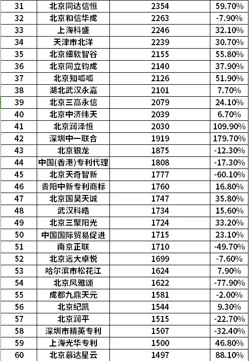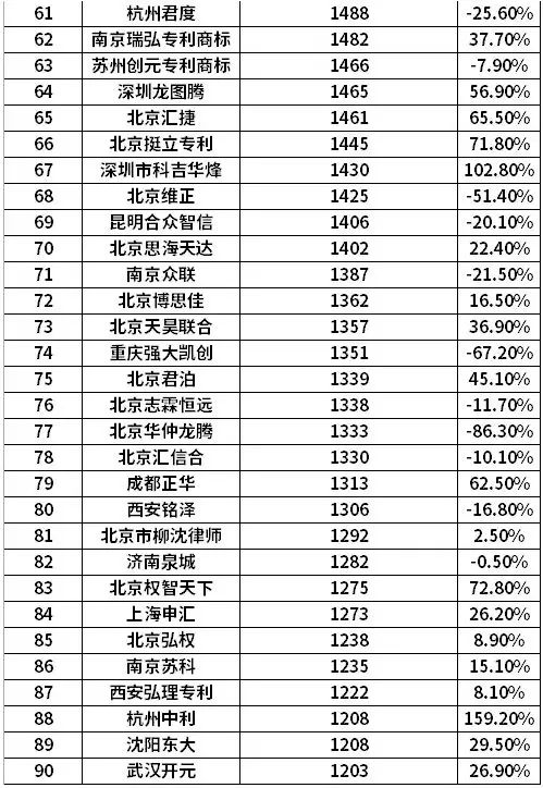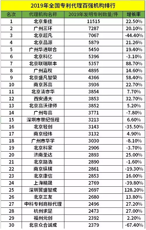 排行依據(jù):排行以2019年發(fā)明申請(qǐng)公開(kāi)專利為依據(jù),對(duì)發(fā)明案件前一百代理機(jī)構(gòu)進(jìn)行排行。其中為保證增長(zhǎng)率數(shù)據(jù)更具準(zhǔn)確性,選擇發(fā)明申請(qǐng)日在2018年且首次公開(kāi)日為2018年的發(fā)明申請(qǐng)進(jìn)行增長(zhǎng)率計(jì)算。